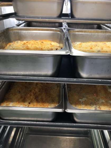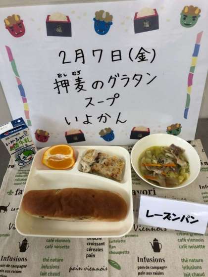 今日は『押し麦のグラタン』でした。グラタンによく使われるマカロニの代わりに、食物せんいたっぷりの押麦を使用しています。クラスごとにミニバットで焼き上げられたグラタンを、教室で取り分けていただきます。