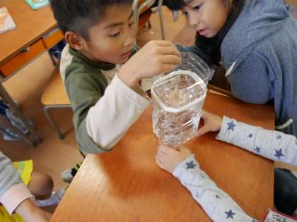 1年生では、ペットボトルを利用してヒヤシンスを植えました。どんな色の花が咲くかたのしみですね。