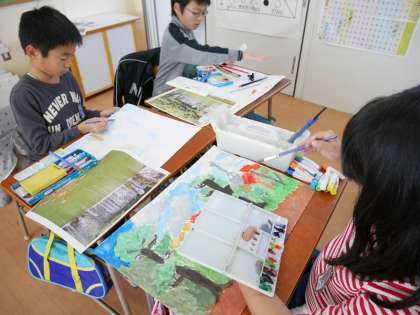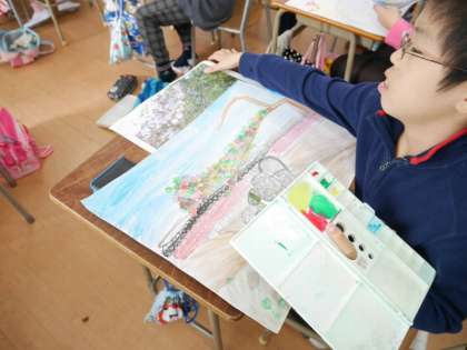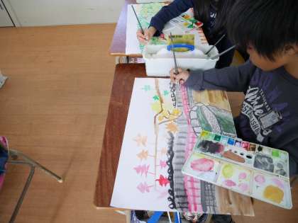 5年生が秋の鶴見緑地の写真をみながら絵を描いています。苦心しているところです。