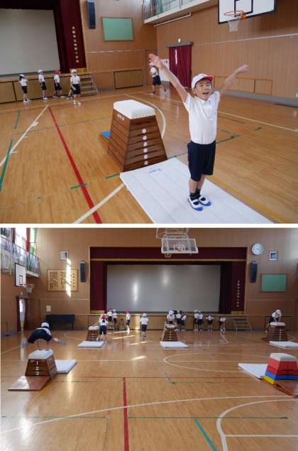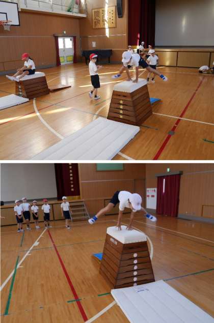 3年生が体育館でとびばこをカッコよくとんでいます。あまりとべない人も何回もチャレンジしてがんばっています。もう少しもう少し、コツがわかれば簡単だよ。がんばれ。