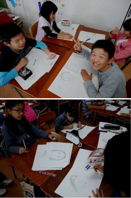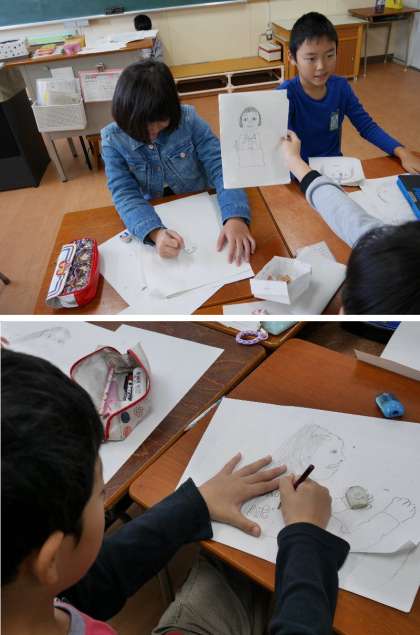 4年生が向かい合ってお互いに顔を描きあっています。真剣にリアルに描いていますね。なかなか似ていますよ。