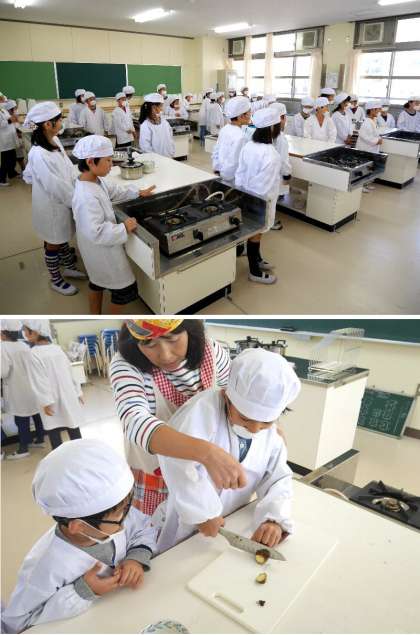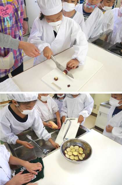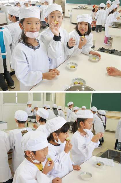 2年生が先日、地域の方のご厚意でサツマイモの収穫をたくさんさせていただきました。そのサツマイモを家庭科室で調理しています。おそるおそる包丁で切ってゆでました。とってもあまくておいしかったです。ほっぺたがおちそうです。
