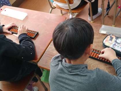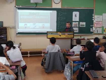 3年生が出前授業でそろばんを学習しました。そろばんが初めての子も多く、電子機器だけではない計算道具をあることを知り、子どもたちは遊び感覚で、楽しんで取り組んでいました。この教室は明日も続きます。
