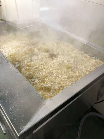 今日は大人気の「鶏肉のからあげ」でした。下味を付けてでんぷんをまぶした鶏肉を、大型フライヤーで揚げていきます。