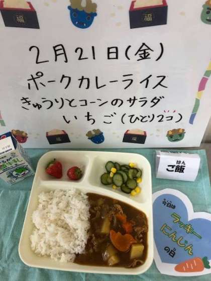 今日はラッキーにんじんの入ったポークカレーライスでした。ハートやお花、うさぎ、クマなどいろんな形を作っていただきました。サンプルは、トリの形のにんじんでした。