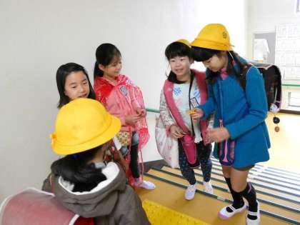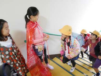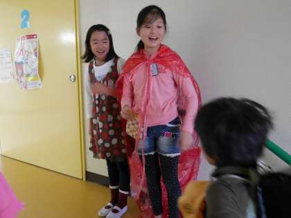 今週は児童会のあいさつ運動が続きます。女の子のあいさつレンジャーがマントをつけて登場です。しっかりとあいさつをしてカードをもらっています。明るい笑顔がいいですよ。
