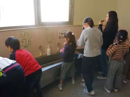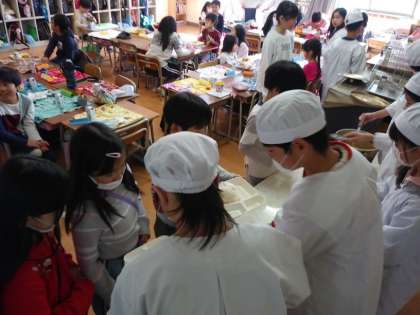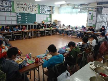 1年生から6年生までたてわり班で給食交流をしました。高学年がお世話をして中学年、低学年はその手際よさに感心していました。みんなで席を並べて、仲良くカレーをいただきました。食後の歯磨きも一緒にすることで、学年を超えて子ども同士が学びあう、有意義な給食時間となりました。