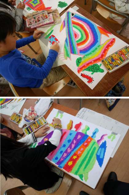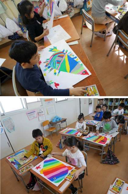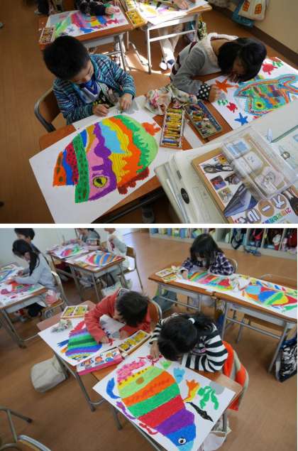 1年生が描いているおさかなの絵が完成しました。よくできていますね。