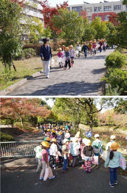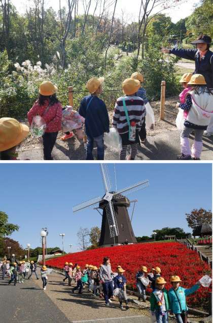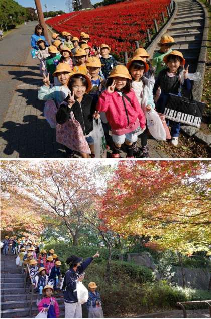 今日は天気もよくなりました。少し寒いかなとおもいましたが、太陽の光が気持ちよくて暖かかったですね。1年生は鶴見緑地へ秋をさがしに行きました。風車の丘をとおって、紅葉しているもみじやいちょうを探してあるきました。