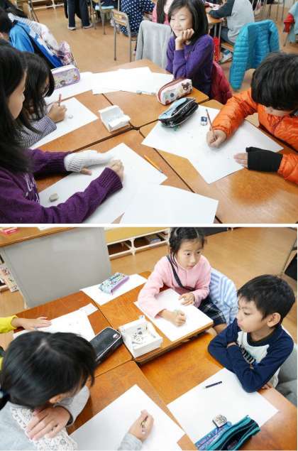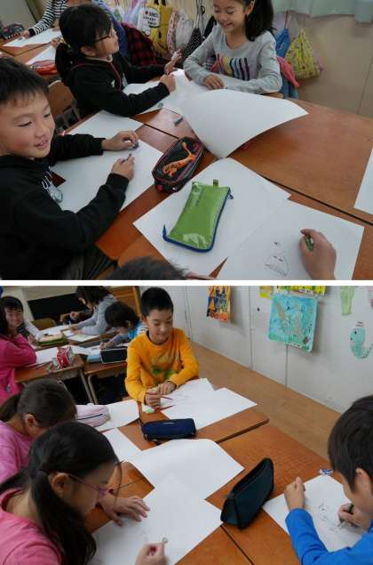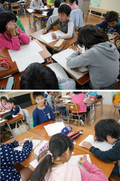 4年生の図工では、お互いに友だちどうしを鉛筆で絵を描いています。順番にモデル役の人を描いていきます。モデルってけっこう大変だね。