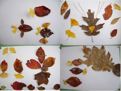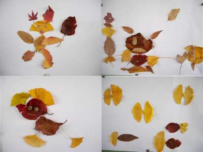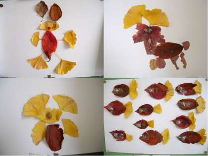 1年生が秋さがして集めた落ち葉で作った作品です。とってもたのしくいい作品ですね。