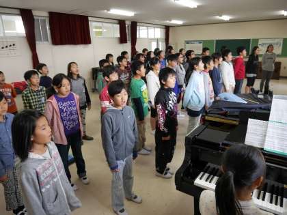 音楽発表会では、1〜3年と4〜6年に分かれて発表会をおこないます。高学年全員の合唱は、ほら、今年とっても有名になったあの映画の・・・そうですあれですね。6年生がピアノを弾いて練習しています。もう一度あの名場面を思い出して・・・