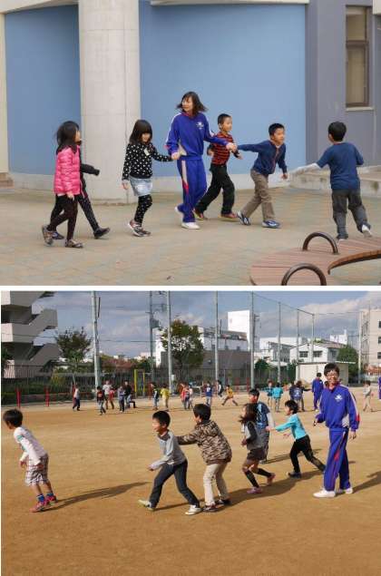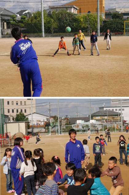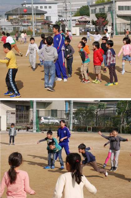 中学生たちは、お昼休みには学級の子どもたちと一緒にボールあそびなどたのしんでいました。子どもたちに人気がありますね。