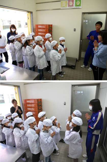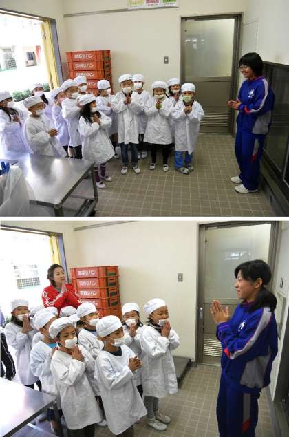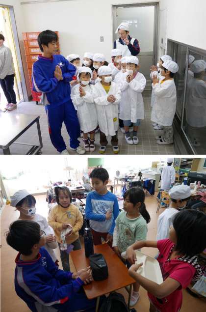 給食をとりに当番の子どもたちと給食室へ。手をあわせて「いただきます」