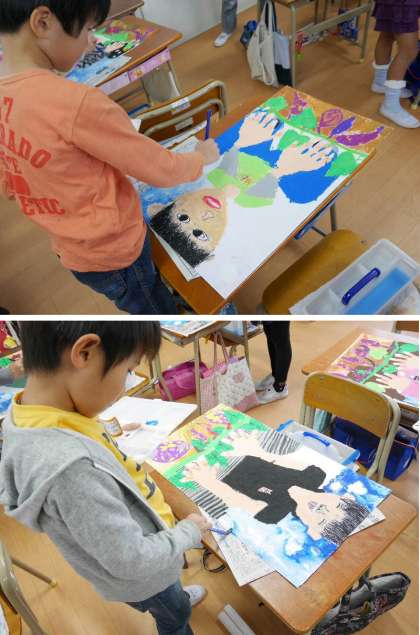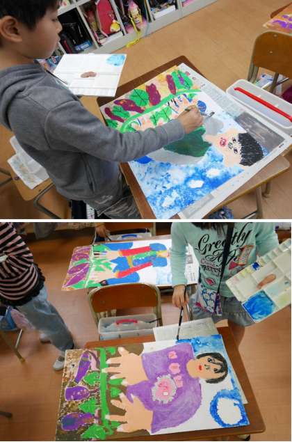 2年生がおいもほりの体験を絵具でしあげています。今日は「空」をきれいにぬり仕上げています。絵具をにじまして雲も描きます。いいかんじに仕上がってきましたね。