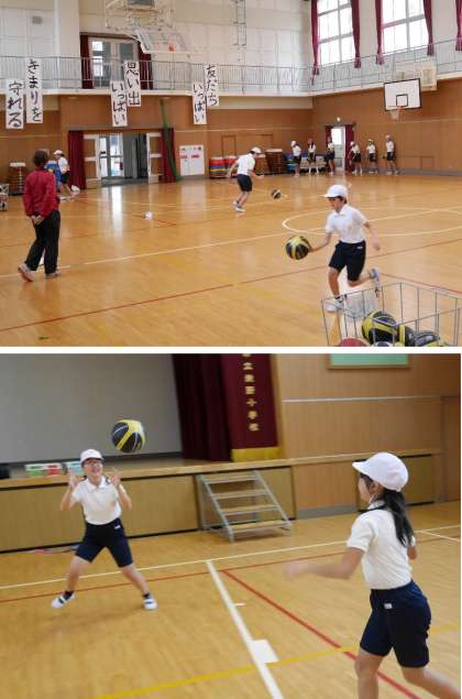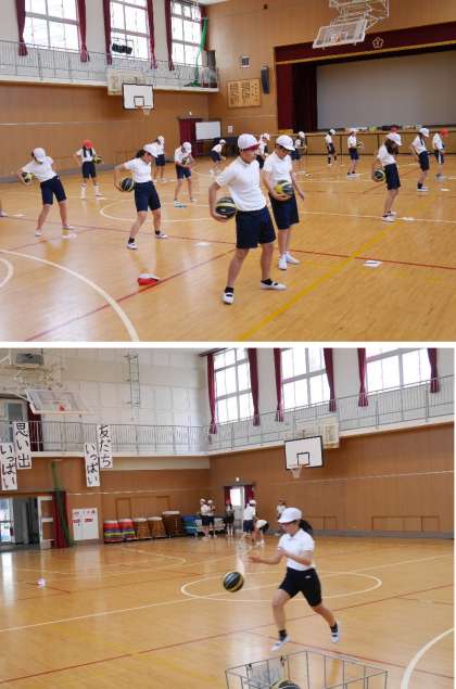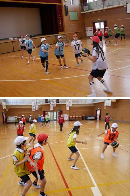 6年生がバスケットボールの授業をしています。さすが6年生です。動きがさまになっていますね。デェフェンスもしっかり守り、試合も楽しそうです。