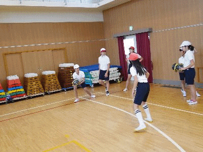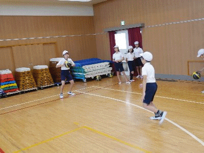 6年生の体育でバスケットボールの基本練習をしています。どうです。うまいものでしょう。