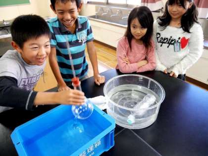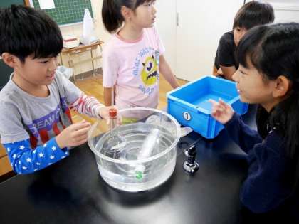 4年生の理科の実験です。フラスコをお湯と水につけて、空気の体積が増えたり減ったりする実験をしていました。おもしろいですね。
