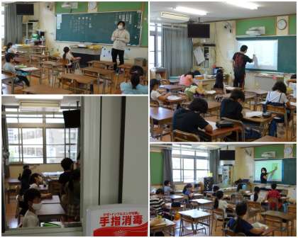 それぞれの学級では学習も進めています。教室の前には手指消毒用の薬剤も準備しています。(写真中)