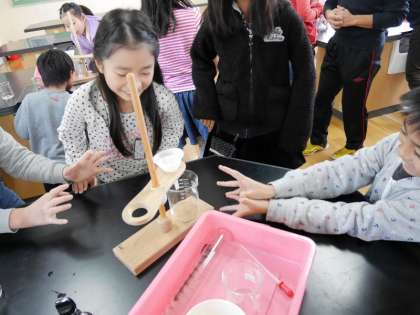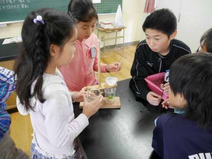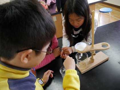5年生の理科では、ミョバン水と食塩水をつかって、実験をくりかえしてきました。どれだけ溶けるか、重さはかわるのかとかです。実験ではろ紙でろ過しています。うまくできるかな。両手で念をこめて実験をしている班もありますね。