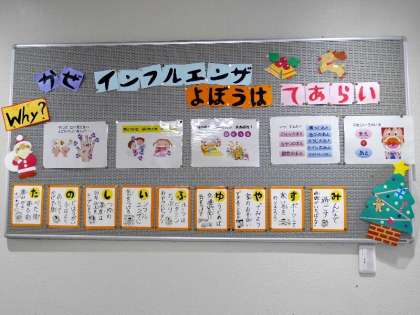 1年と4年の掲示板です。子どもたちの作品が展示されています。保健室前には保健の先生が「インフルエンザの予防」について展示していただきました。寒くなってきました。対地用に気を付けてくださいね。