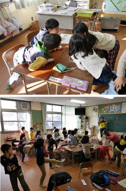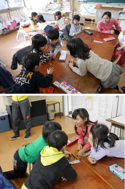 1年生で班ごとに代表者が先生からの指示文をきいて、班にもどってみんなに伝えます。顔をよせあってしっかりと伝えています。最後にちゃんときいてつたわったかどうか、先生の指示したポーズをしています。なかなかむずかしいポーズだね。