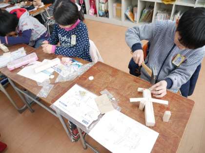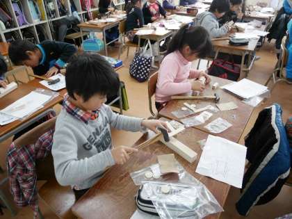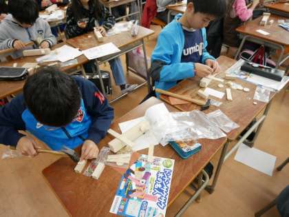 3年生が「トントンサクサク 木の名人」で作品をつくっています。木片をクギでとめていきます。なかなかまっすぐに打てずに、横からクギがとびだしたりと大変です。かなづちの後ろにはくぎ抜きもついているから、何回も打ち直してがんばってくださいよ。