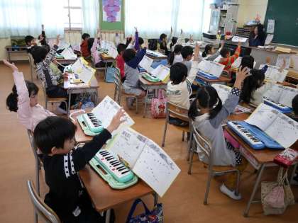 1年生が鍵盤ハーモニカの練習をしています。指だけだして「2」「3」・・と指番号で練習して確認しています。