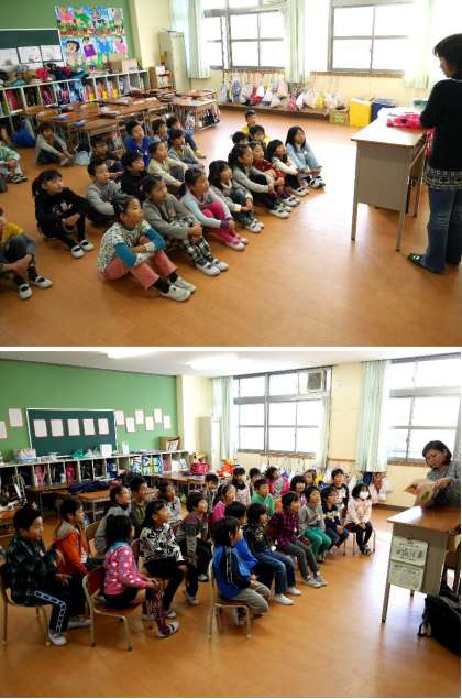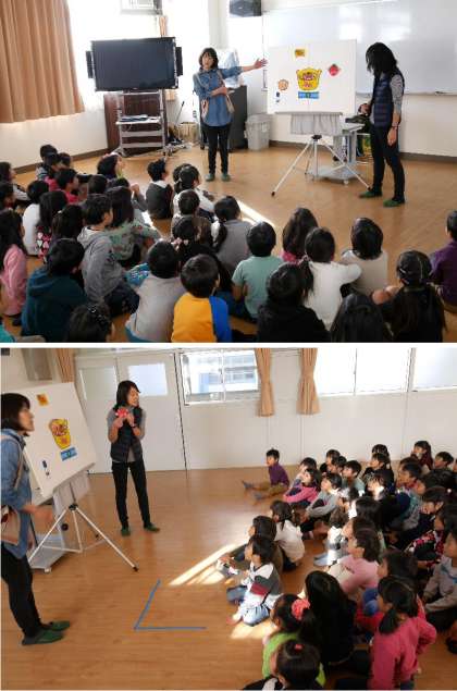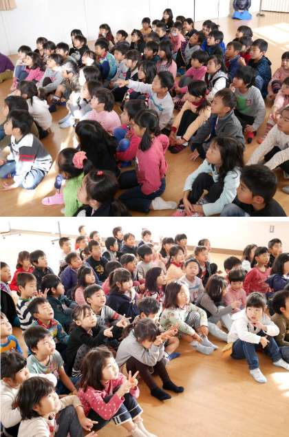 図書ボランティアさんに読み聞かせをしていただきました。今日は1年・2年・5年です。1年生は多目的室でパネルシアターでした。子どもたちは鍋ができあがるため一緒に野菜をいれたりジェスチャーをして楽しそうです。指をさして声をだして一生懸命に聞いて集中しています。