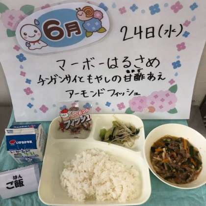 今日はマーボーはるさめでした。北海道産ばれいしょでん粉を原料としたはるさめ(写真中央)を使用しています。