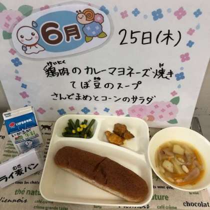 今日の献立は鶏肉のカレーマヨネーズ焼き、てぼ豆のスープ、さんどまめとコーンのサラダで、パン(ライ麦)によく合う献立でした。