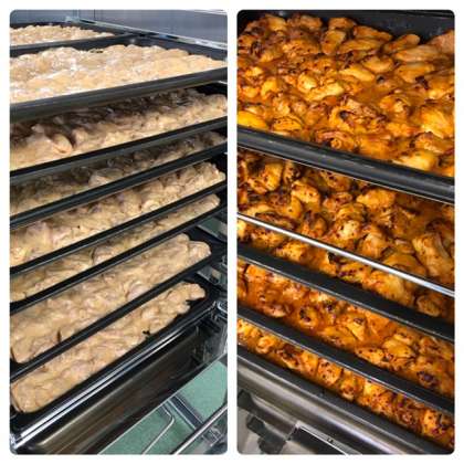 中央の写真は、鶏肉のカレーマヨネーズ焼きの焼く前(左)、焼いた後(右)の写真です。
