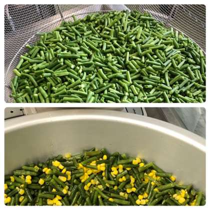 サラダに使うさんどまめは、3cm幅に切り、大きな金ザルでゆでます。別にゆでたコーンと、タライで混ぜ合わせ、ドレッシングであえて各クラスに配缶します。