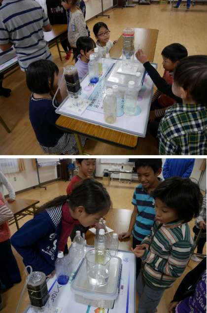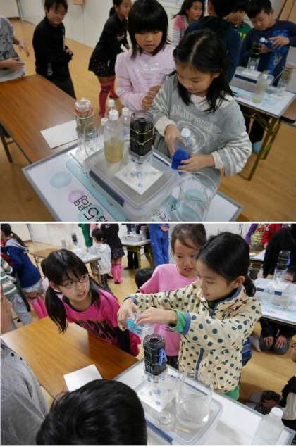 4年生の水道教室で、よごれた水の浄化を砂や炭をつかって各班ごとに実験しのした。ろ過しただけでは水はきれいになっても臭いが残ります。炭を使うと臭いもとれるんですね。