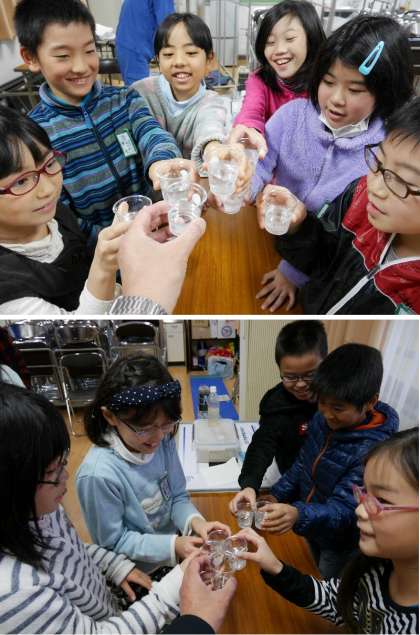 柴島浄水場の水と市販の天然水とを「きき水」をして飲み比べました。どちらもみんなの好みがあるようです。半々くらいでどちらにも票があつまりました。「おいしい おいしい」と乾杯していただきました。