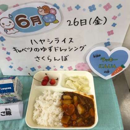今日の給食はラッキーにんじんが入ったハヤシライスでした。