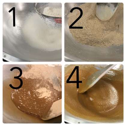 学校給食ではシチューやハヤシライスに使用するルウを手作りしています。中央の写真は、ブラウンルウができるまでの様子です。小麦粉を釜にふるい入れ、褐色になるまでからいりし、サラダ油を加えて色付くまで炒めます。