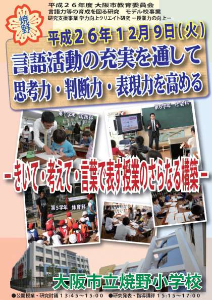 12月9日(火)、焼野小学校で「言語活動の充実を通して 思考力・判断力・表現力を高める -きいて・考えて・言葉で表す授業のさらなる構築-」を研究主題として、言語力等の育成を図る研究モデル校事業、学力向上クリエイト研究−授業力の向上−の研究発表会を開催いたします。