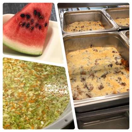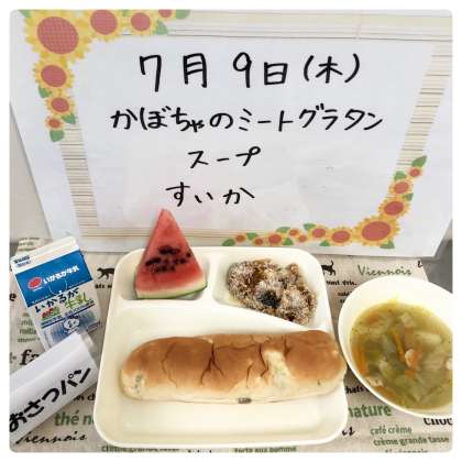今日の献立は、かぼちゃのミートグラタン・スープ・すいか・おさつパンでした。