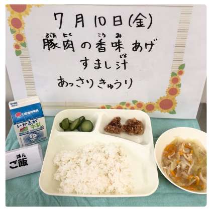 今日の献立は、豚肉の香味あげ・すまし汁・あっさりきゅうり・ごはんでした。