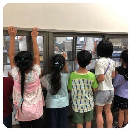 一年生が、学校探検で給食室の中の様子を見学に来ました。大きな釜でみそ汁を作っているところや、焼き物機で焼く前のさけを、ガラス越しに見ることができました。