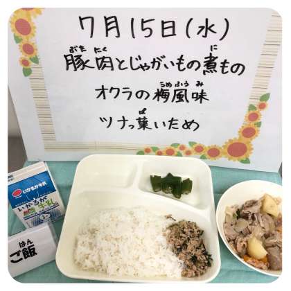 今日の献立は、豚肉とじゃがいもの煮もの・オクラの梅風味・ツナっ葉いため・ごはんでした。