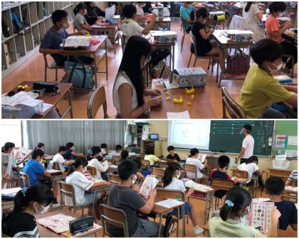 一枚目は授業の様子。理科の教材を組み立てているところと英語の授業。