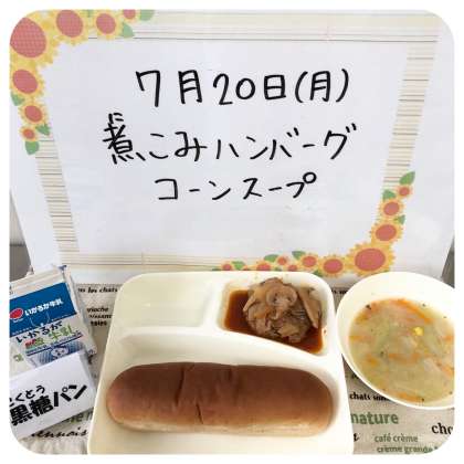 今日の献立は、煮込みハンバーグ・コーンスープ・黒糖パン・牛乳でした。