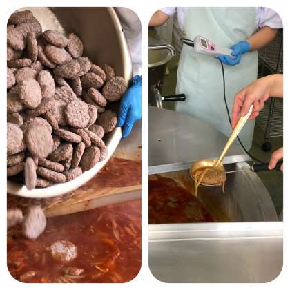加熱ができたことを確認するために、中心温度を測ります。中心温度はひとつの献立につき3カ所の温度を測定します。測定後は、さらに1分間加熱を続け、火を止めます。