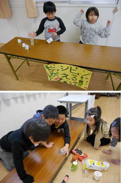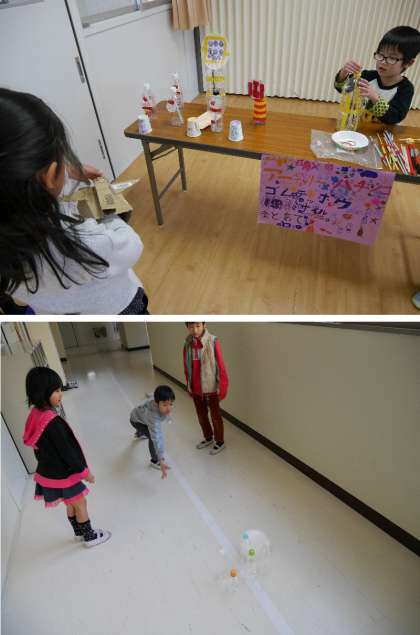 2年生が多目的室で、自分たちで作った手作りおもちゃで楽しんでいます。それぞれのコーナーをまわって遊びました。「ピョンピョンかえる」「コトコト車」「魚つり」「くうきほう」「フリスビーあて」「ゴムてっぽうでまとあて」などなと、くふうをこらしたおもちゃがならんでいます。たのしいね。