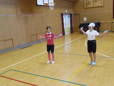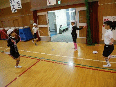 体育館で4年生の体育です。なわとびの練習をしています。「前・交差ステージ」「前二重ステージ」「後・後交差ステージ」「ふり返りとびステージ」「ステップとびステージ」など、グループで練習しています。うまいものでしょう!