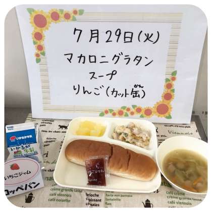 今日の献立は、マカロニグラタン・スープ・りんご(カット缶)・コッペパン・いちごジャム・牛乳でした。