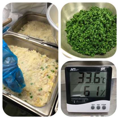 マカロニグラタンは、かまの中で調理した後、クラスごとにミニバットに分け入れ、粉末チーズとパン粉を混ぜ合わせたものをふります。そのあとに焼き物機で焼くことで、チーズの風味とほどよい焼き色のついたグラタンができあがります。