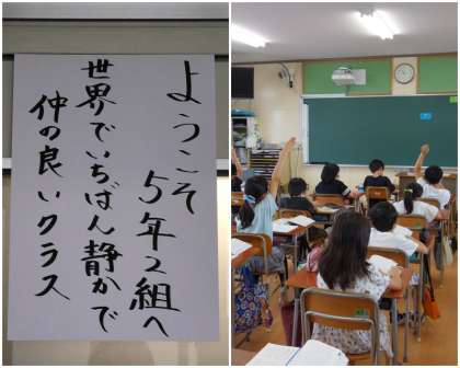 「ようこそ 5年2組へ 世界でいちばん静かで 仲の良いクラス」と書いてあります。